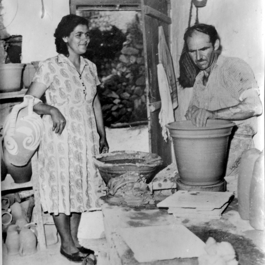 Δύσκολα τότε τα χρόνια γι’αυτό όταν τελείωσε το Δημοτικό δε συνέχισε το σχολείο και άρχισε να δουλεύει με τον πατέρα του. Έφτιαχναν τα παραδοσιακά κουμάρια, λαγήνια, κουντρούπια, που διακοσμούσε η μητέρα του με την παλιά τέχνη και τον ασβέστη.